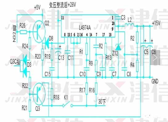 Ø  測試芯片L4974A 輸出電壓15V為0V,查芯片8腳軟啟動電壓是0.5V,正常值為3.85V,所以芯片L4974A的8腳輸入電壓不對。經查Q2輸入觸發電壓正常。