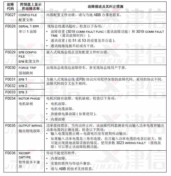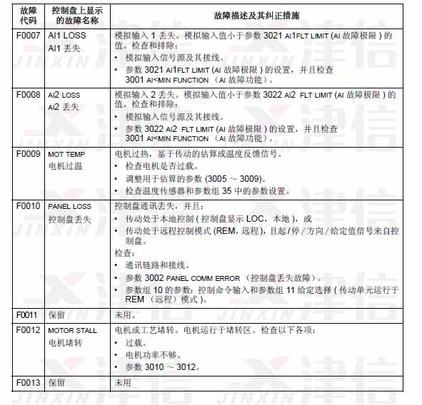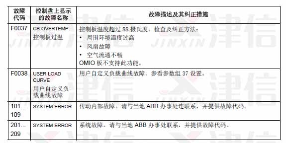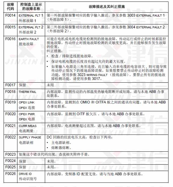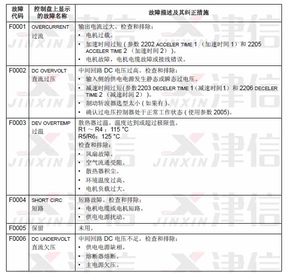 可以通過MENU/ENTER鍵來(lái)清除故障信息。如果故障依然存在,故障信息會(huì)在幾秒鐘后再次出現(xiàn)。此時(shí)需要根據(jù)故障代碼來(lái)進(jìn)行相應(yīng)的檢查和采取應(yīng)對(duì)措施。