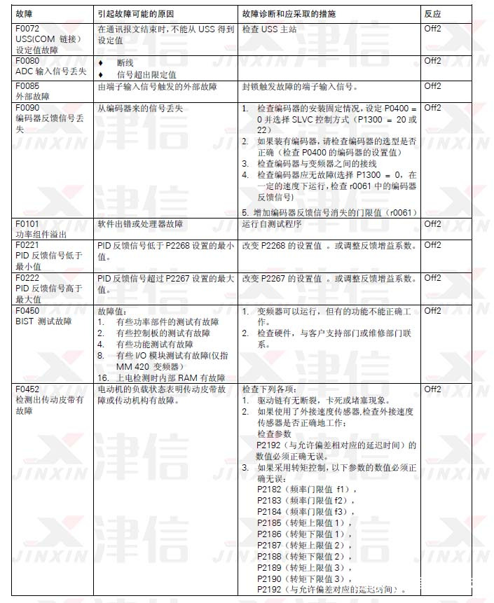 故障信息以故障碼序號的形式存放在參數(shù)R0947 中(例如,F(xiàn)0003=3)。相關(guān)的故障值可以在參數(shù)R0949 中查到,如果該故障沒有相關(guān)的故障值,R0949 中將輸入0。而且,可以讀出故障發(fā)生的時(shí)間(R0948)和存放在參數(shù)R0947 中的故障信息序號(P0952)。