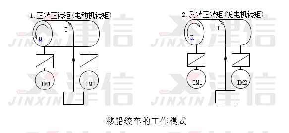 移船絞車是重要的海工設備,在海上工作平臺、鋪管船里有廣泛的應用。移船絞車的工況與起升相似,正轉時收線,變頻器工作于電動機模式,電機對負載作功;反轉時放線,變頻器工作于發(fā)電機機模式,負載對電機做功,要求變頻器內置制動晶體管。與普通起升不同的是,移船絞車連續(xù)工作時間很長(數小時),所以對于變頻器的過載能力要求不高,但是要求變頻器具有100%制動轉矩連續(xù)運行的能力。
