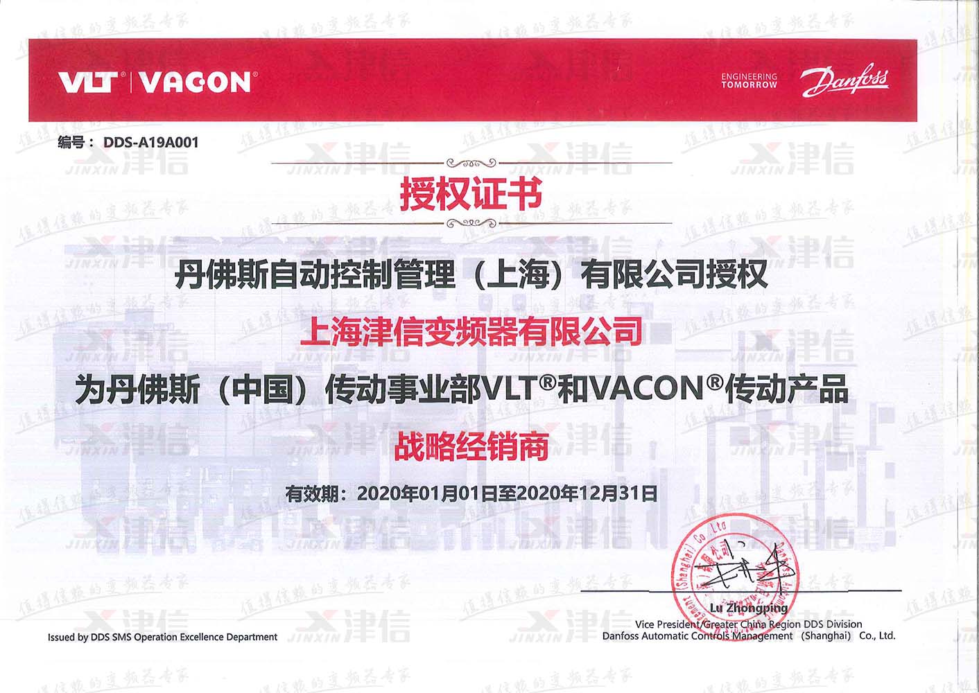 丹佛斯傳動戰略經銷商上海津信授權證書